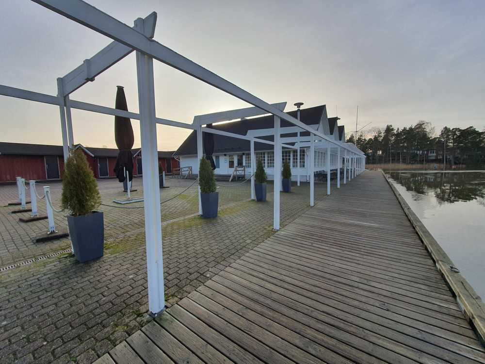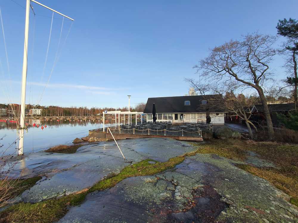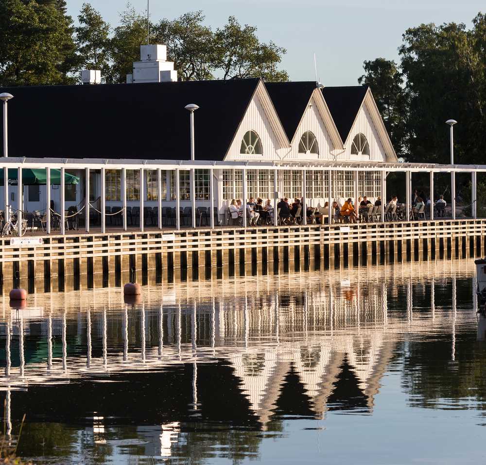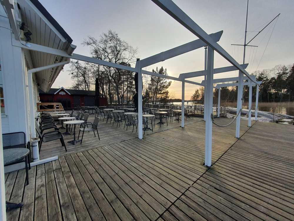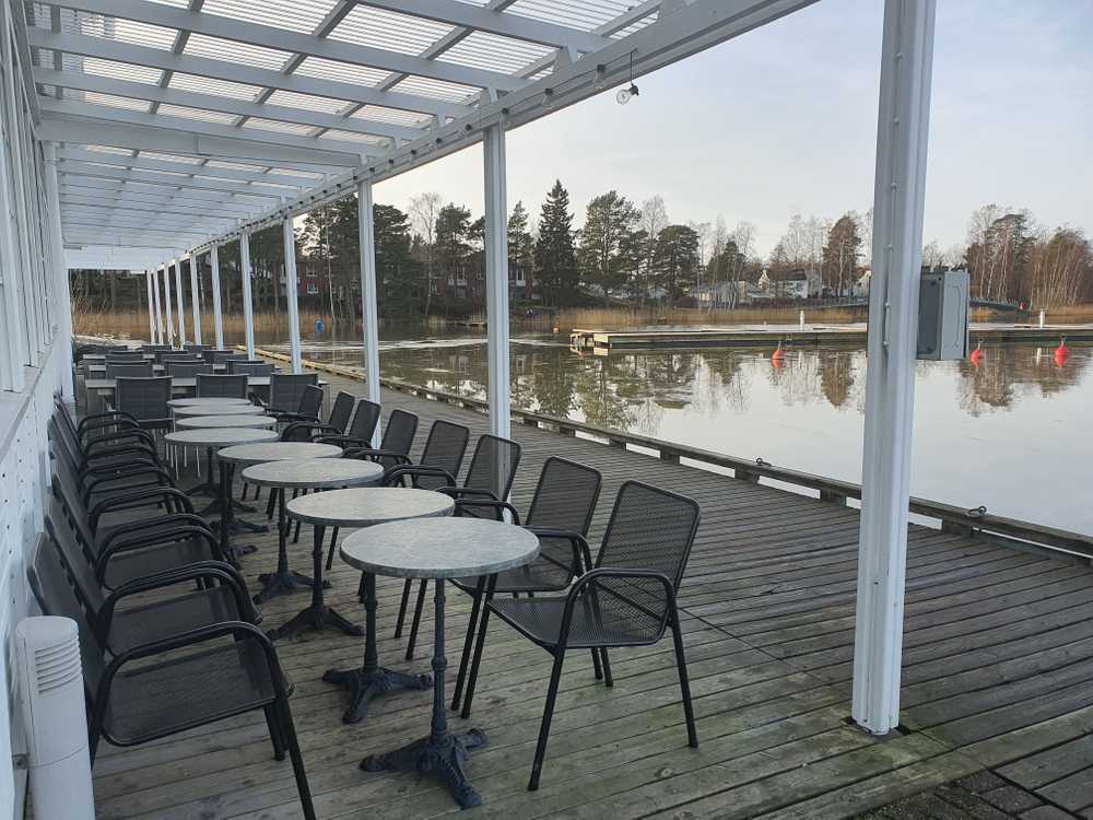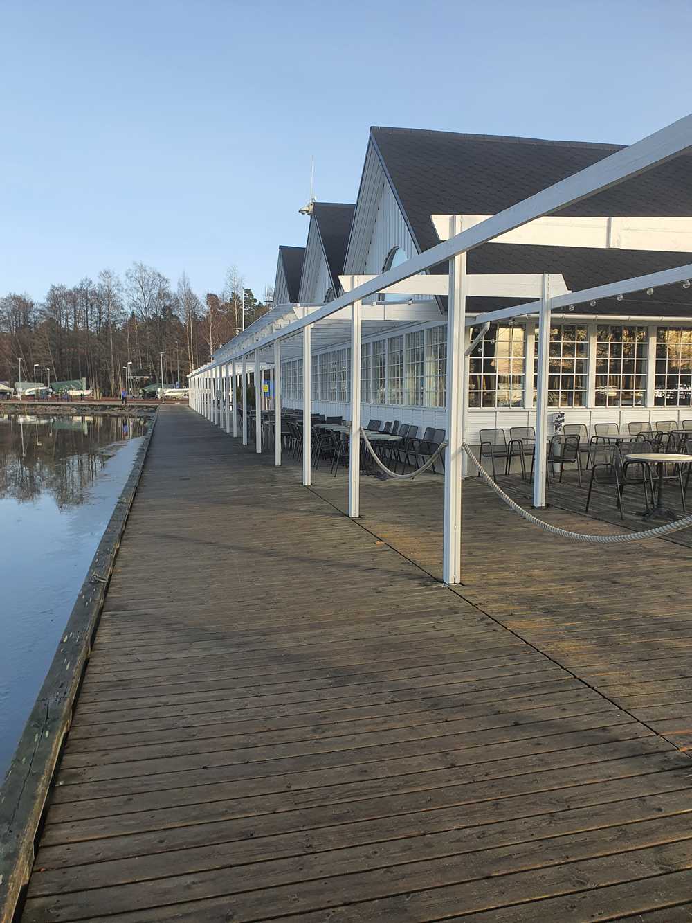 Veneellä saapuville asiakkaille on varattu runsaasti paikkoja ravintolan edustalle.